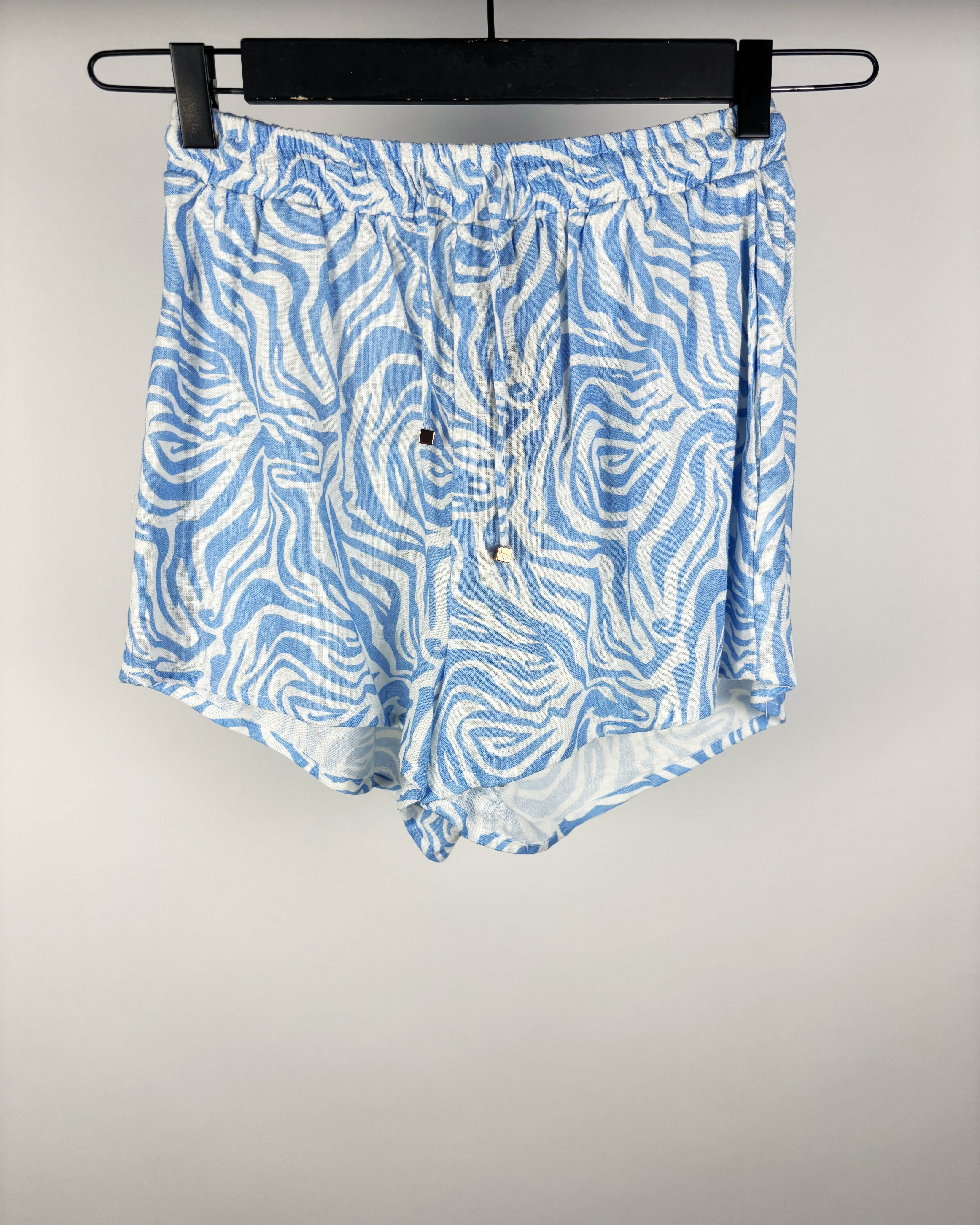 Short tipo lino crudo con estampa celeste polonio